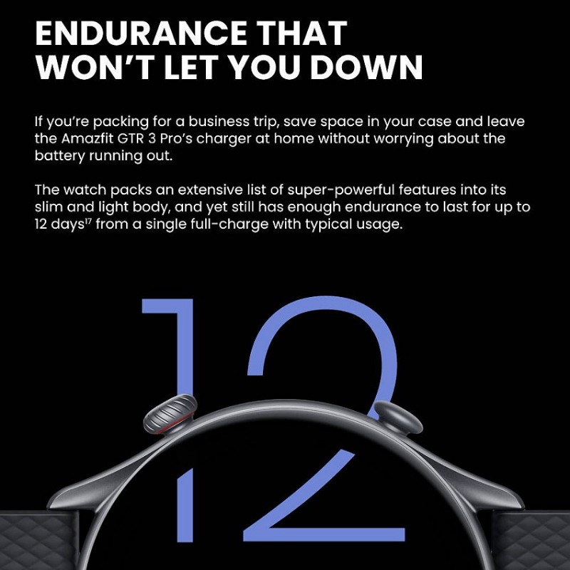 Til að byrja með er mikilvægt að þú vitir að GTR 3 Pro úrið þitt mun alltaf vera tilbúið til að fylgja þér á ferðalögum þínum og fylgjast með framförum þínum, þar sem það tryggir mjög fínstillt rafhlöðustjórnunarkerfi. Reyndar, með einni hleðslu getur 450 mAh rafhlaðan í Amazfit GTR 3 Pro enst í allt að 12 daga * við venjulega daglega notkun, allt að 6 daga * með mikilli notkun, allt að 35 klukkustundir * með GPS virkt . og allt að 30 dagar * í sparnaðarham.