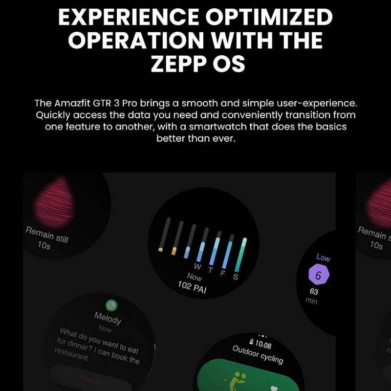 Hér er önnur frábær aðalpersóna Amazfit GTR 3 Pro: nýja stýrikerfið Zepp OS, sem mótar stórkostlega og endurnýjaða litasamsetningu, tekur minna pláss og inniheldur forritavistkerfi, með þægilegri samskiptum og skjótum aðgangi að uppáhaldsaðgerðunum þínum.