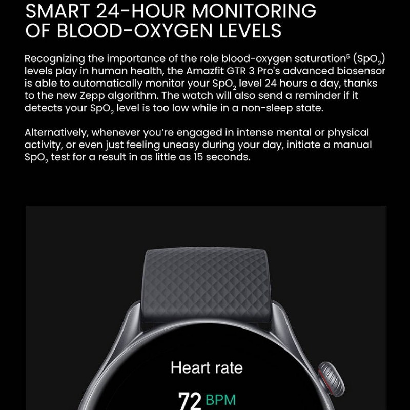 Með endurbættum BioTracker 3.0 PPG líffræðilegum tölfræðiskynjara, sem inniheldur 6 ljósdíóða samanborið við 2 í tilfelli fyrri kynslóða, framkvæmir Amazfit GTR 3 Pro margar ofurnákvæmar heilsumælingar á mjög skilvirkan hátt, svo sem kvikt eftirlit með hjartslætti eða hjartsláttartíðni. súrefnismettun í blóði, svo og PAI (Personal Activity Intelligence) * heilsumatskerfið, sem safnar öllum þessum gögnum og umbreytir þeim í eitt tölugildi svo þú skiljir betur almennt heilsufar þitt.