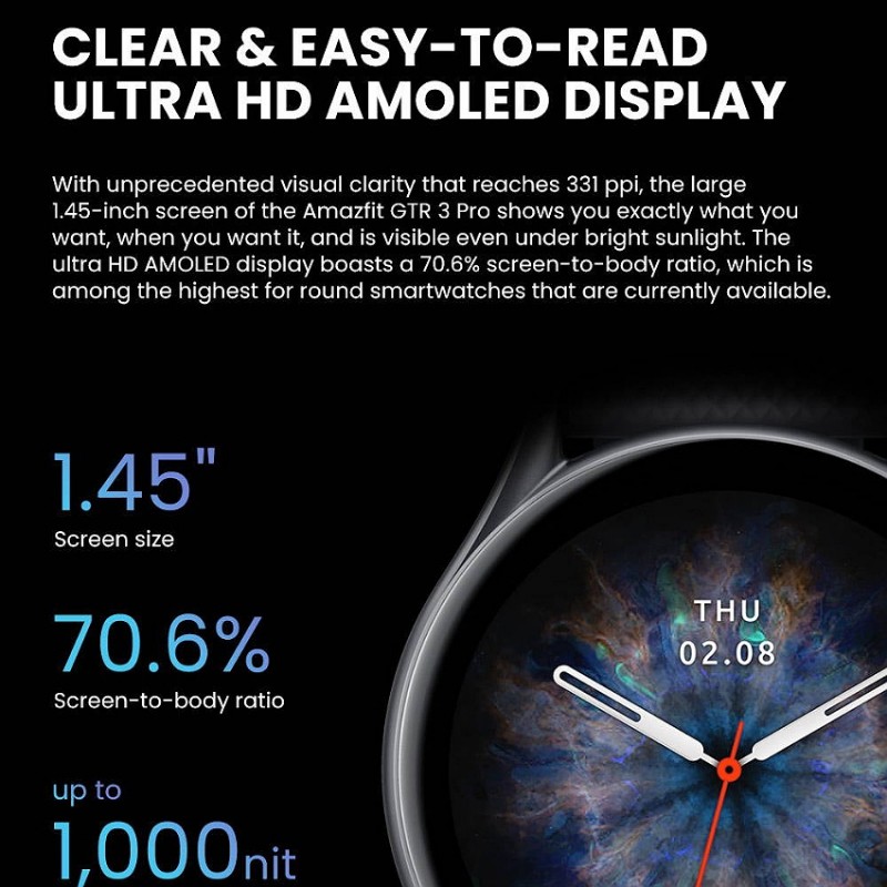 Skoðaðu nú öll gögnin þín í fullkomnum gæðum, jafnvel í björtu sólarljósi án þess að þurfa að ná í farsímann þinn: GTR 3 Pro samþættir UHD AMOLED skjá með díla 480 x 480 upplausn og háu birtustigi allt að 1000 nits .