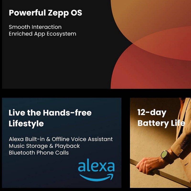 UHD AMOLED skjár - 1,45" kringlótt hönnun - 480 x 480p upplausn - Heilsueftirlit allan sólarhringinn - Zepp APP - Hliðarleiðsöguhnappur - Allt að 12 daga dæmigerð dagleg notkun - Hringdu Bluetooth - Raddaðstoðarmaður - innbyggð tónlistarspilun - Meira en 150 íþróttastillingar - 5 ATM vatnsheldur