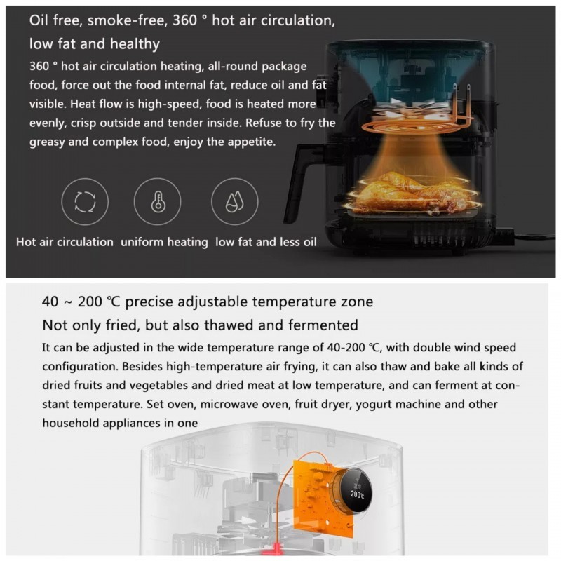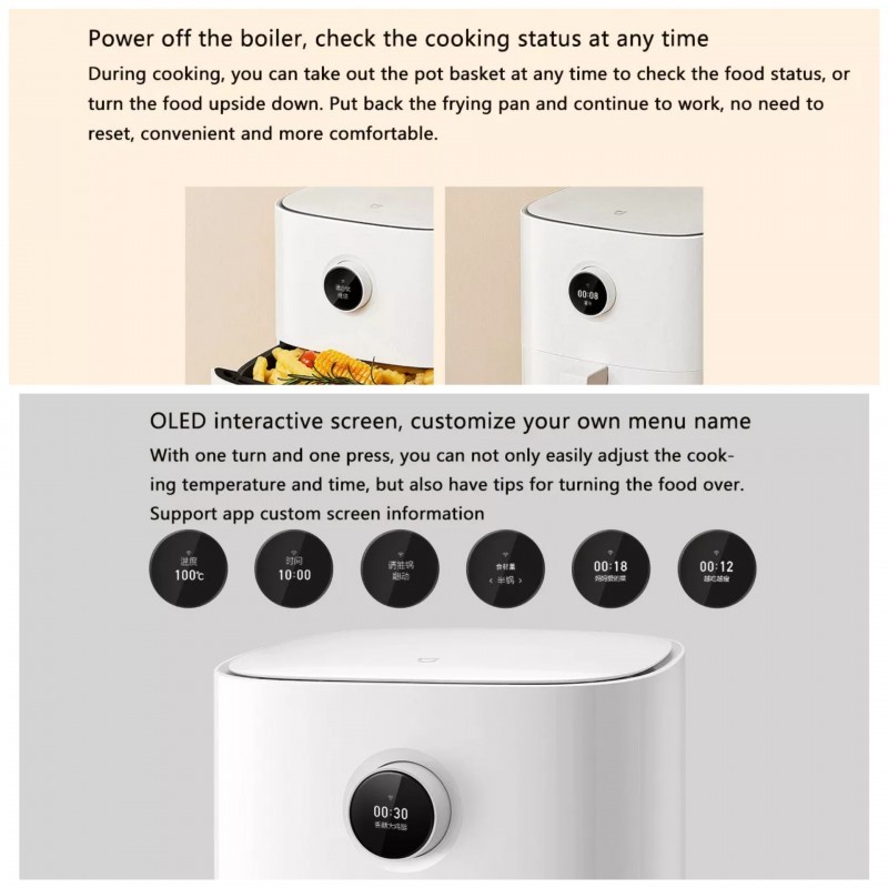 Vítt hitastigssvið (40°C til 200°C): Með stillanlegu hitastigi getur þú affryst, þurrkað, gerjað, steikt, bakað, ristað og meira til. Frá því að gerja jógúrt við 40°C til að baka kökur eða rista kjöt við 200°C, Xiaomi Mi Smart Air Fryer er fjölnota tæki sem ræður við mörg eldhúsverkefni.